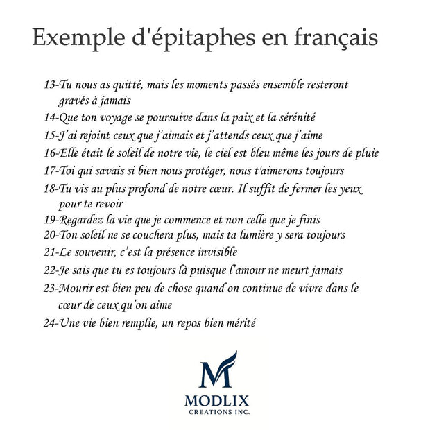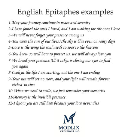 Choose from our of 12 carefully crafted epitaphs, each throughtfully written to honor a life with meaning, grace and emotion. These beautifull epitaphs offer a timeless way to express love, remembrance and legacy, allowing you to select the words that resonate most deeply with your loves one story. You can also create your custom one.